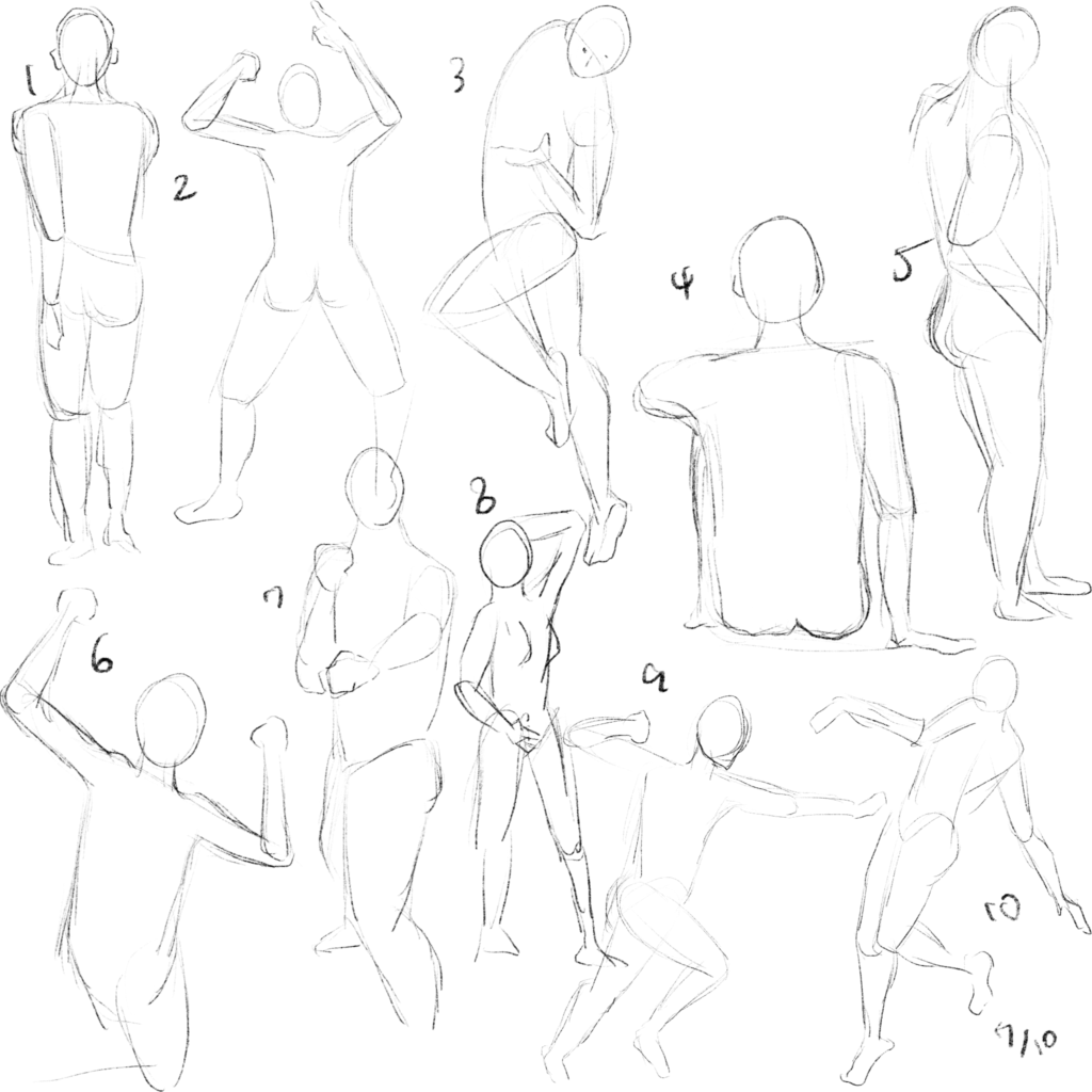 5とかの横のポーズを描くのは体の厚さが表現しづらく難しく感じました。