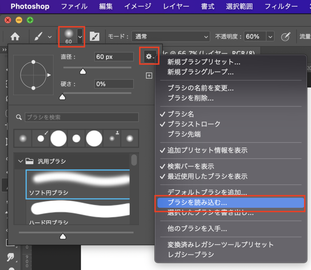 下記のようにブラシの設定>歯車マーク>ブラシを読み込むを選択します。